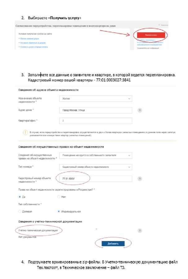 3. подать через Портал заявление, выбрав цель обращения «Согласование переустройства и (или) перепланировки помещения в многоквартирном доме», заполнив необходимые поля интерактивного запроса и загрузив проект перепланировки с иными документами (при необходимости);