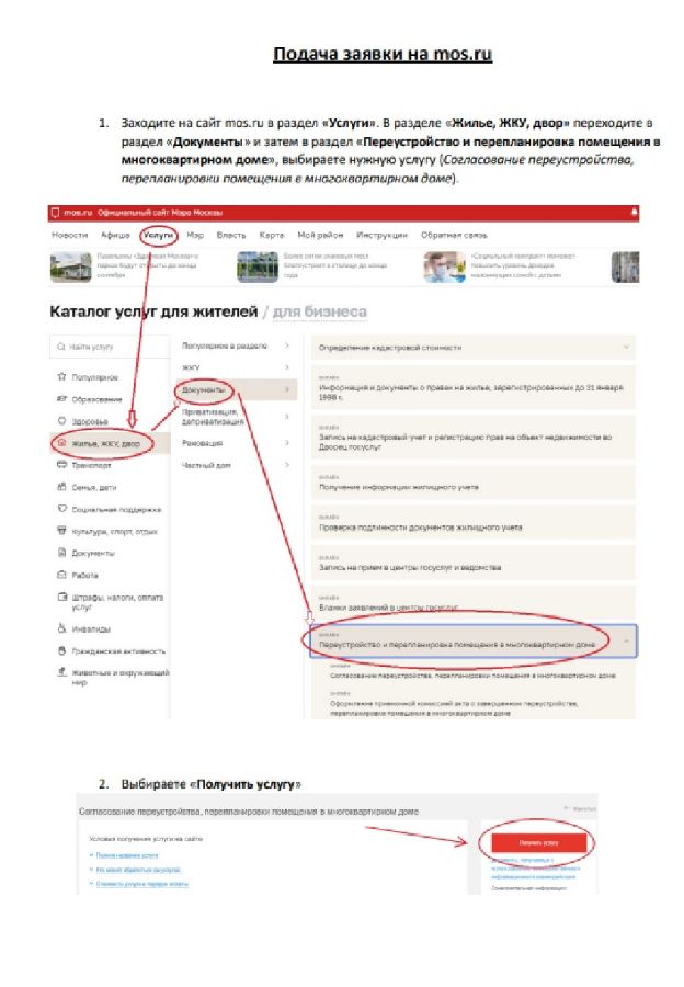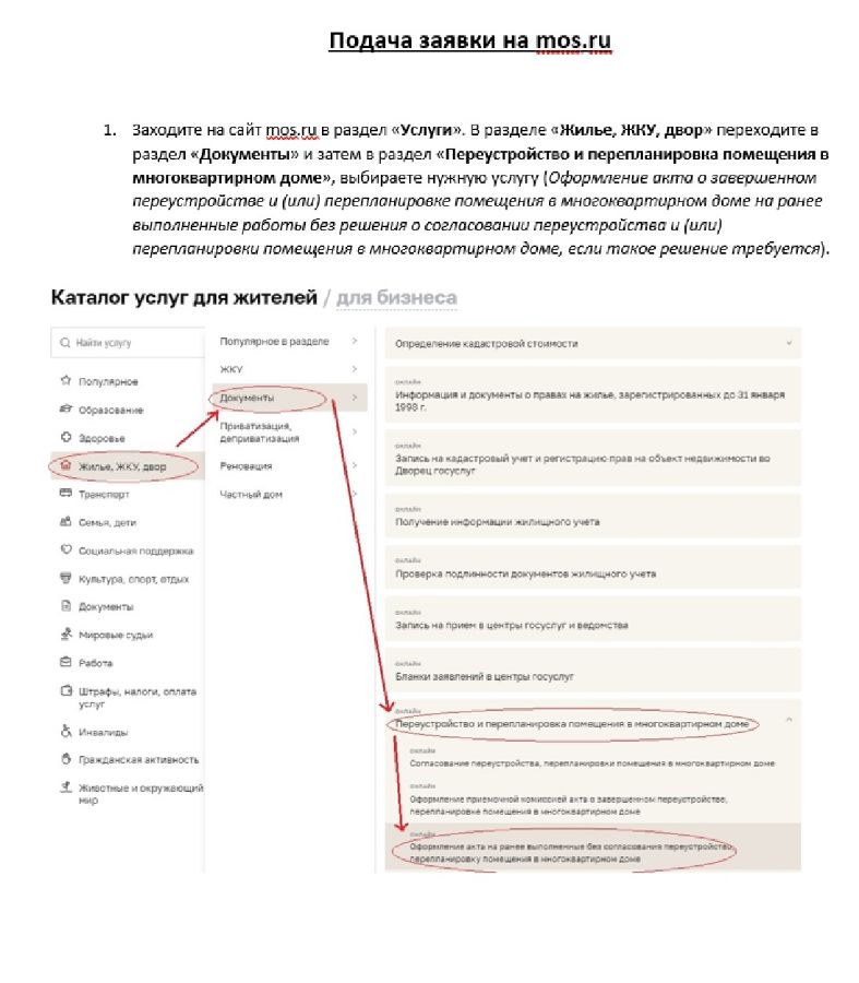 Если Ваша перепланировка не требует получения распоряжения о согласовании перепланировки, то после выполнения ремонта, Вы можете самостоятельно подать заявление через Портал мос.ру, выбрав цель обращения «Оформление приемочной комиссией акта о завершенном переустройстве и (или) перепланировке помещения в многоквартирном доме», заполнив необходимые поля интерактивного запроса и загрузив эскиз перепланировки с иными документами (при необходимости);